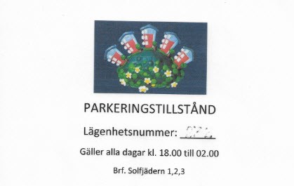 Varje boende får ett parkeringstillstånd för gäster som gäller gratis parkering kl. 18-02 alla dagar på alla platser. Skall ligga väl synligt i framrutan.